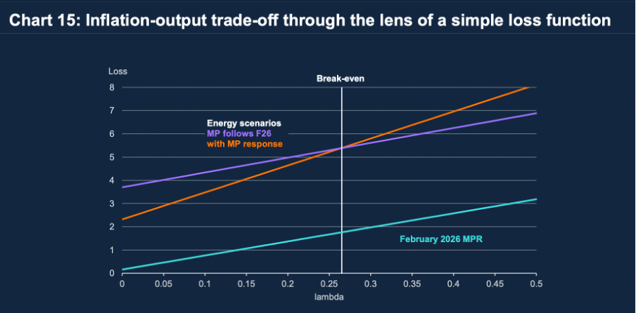 Compared to the February MPR inflation-output combination, the loss function due to the Middle East conflict is everywhere higher since inflation is expected to be higher. But should the policymaker respond? For the case where λ = 0 monetary policy should tighten (as on the far left of the chart) since the inflation nutter is willing to drive output far below potential to achieve a quicker return of inflation to target.